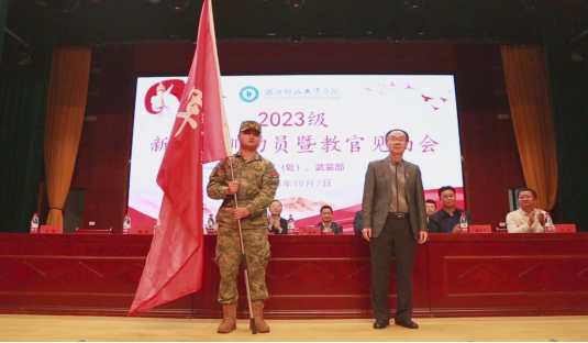 李宜兵代表学校向军训团团长授予“2023级新生军训团”团旗。团长徐杰代表全体军训教官郑重承诺:以良好的形象组织军训;以过硬的素质抓好军训;以严谨的作风检验军训。