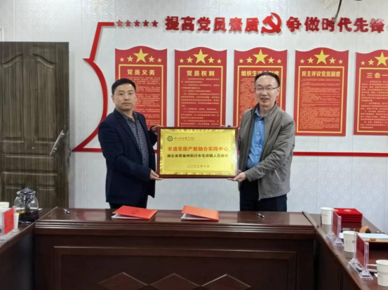 在会双方领导经过充分的研讨交流后,签订共建实践中心框架协议,李宜兵常委代表学校向毛坝镇授非遗茶旅产教融合实践中心授牌,并给谭轲、郭方强、廖建军、王淳颁发了专家聘请证书。